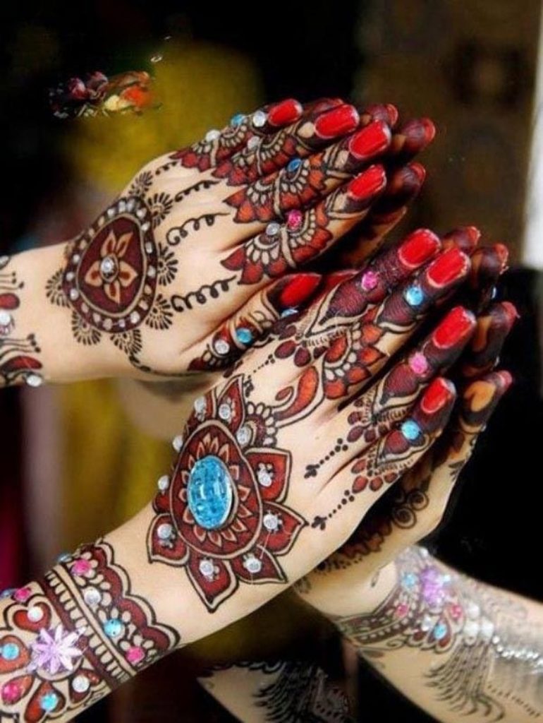 Modern Mehndi design with glitter combines traditional Mehndi patterns with a contemporary touch by incorporating glitter accents. This design features the use of Mehndi cones to create intricate patterns, which are then enhanced by adding glitter on top of the dried Mehndi paste. The glitter can be applied strategically to highlight specific elements of the design, such as the outlines or centerpieces, creating a modern and glamorous look.