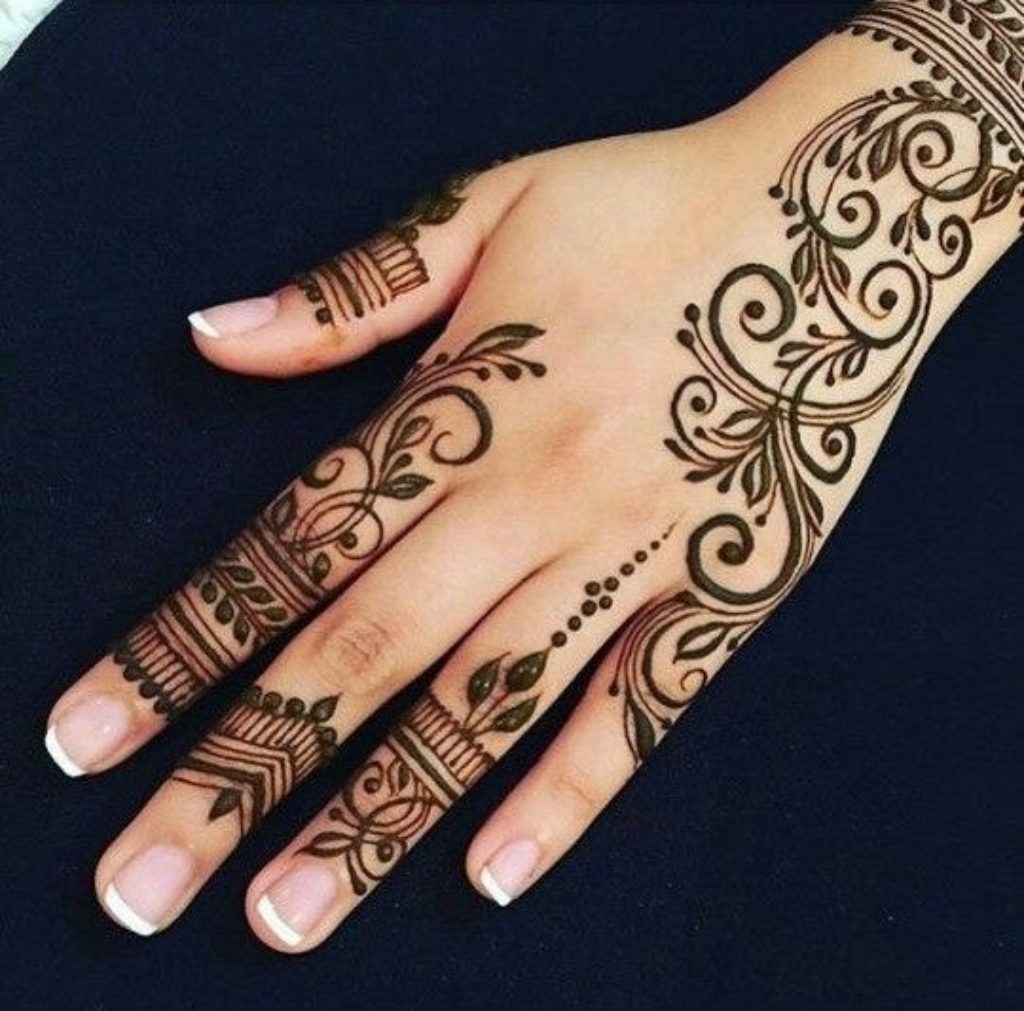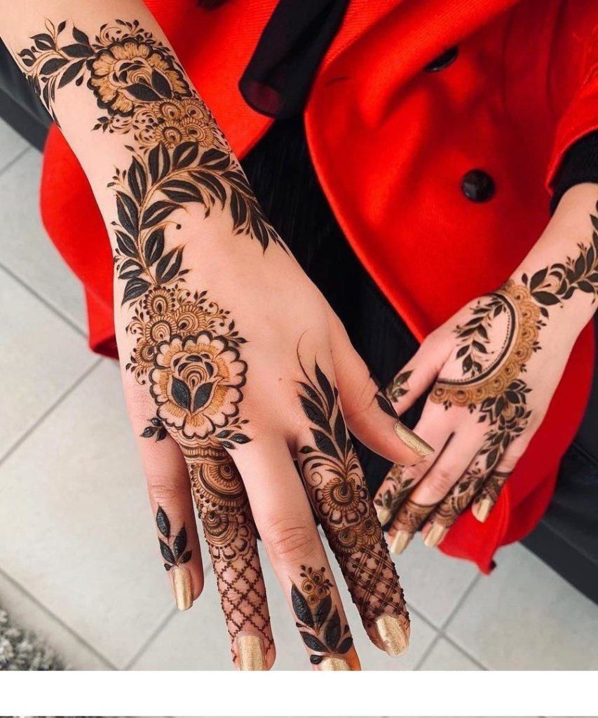Popular Arabic mehndi designs feature intricate symmetrical patterns, mandalas and floral organic shapes. Generally, the patterns are denser closer to the palm while specialized designs such as peacocks, parrots, snakes, and other animals can be used for the back of the hand. Arabic mehndi often features bold line work and larger motifs. They can be combined with contemporary elements to create a unique look.