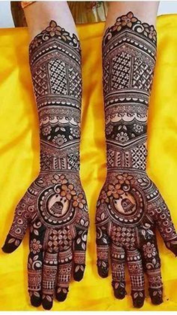 Geometric shapes Mehndi’s design is characterized by the use of precise and symmetrical patterns inspired by various geometric shapes. This design incorporates squares, triangles, circles, or hexagons to create visually appealing compositions. The patterns can be interconnected or independent, forming a mesmerizing and contemporary look. The combination of intricate geometric shapes with Mehndi creates a modern and stylish design.
