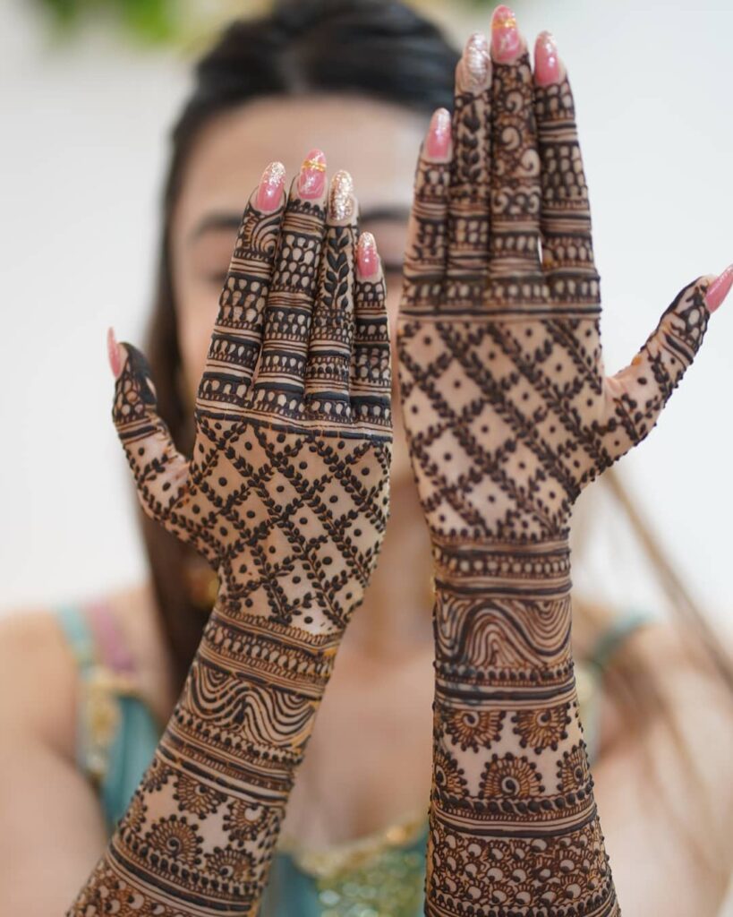 Zardozi Mehndi’s design draws inspiration from the intricate embroidery technique of zardozi. This design incorporates rich and opulent motifs, reminiscent of the regal embroidery work. The patterns are bold, heavily embellished, and often adorned with metallic accents, beads, or sequins. The design may include floral motifs, paisley patterns, or intricate geometric shapes, with a focus on creating a luxurious and eye-catching look.