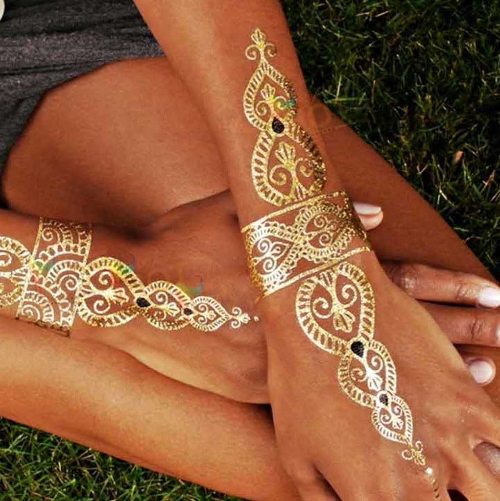 Gold and silver Mehndi design involve using metallic colors to create a stunning and glamorous look. This design typically incorporates gold and silver accents alongside traditional Mehndi patterns. The metallic colors are applied in a way that complements the intricate details of the design, enhancing its beauty and elegance. The gold and silver elements can be used to outline the Mehndi patterns, highlight specific motifs, or create shimmering effects throughout the design.