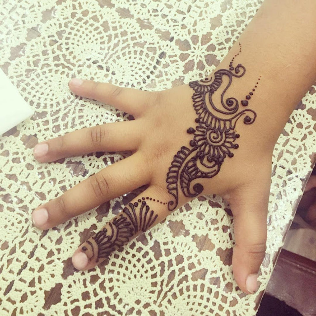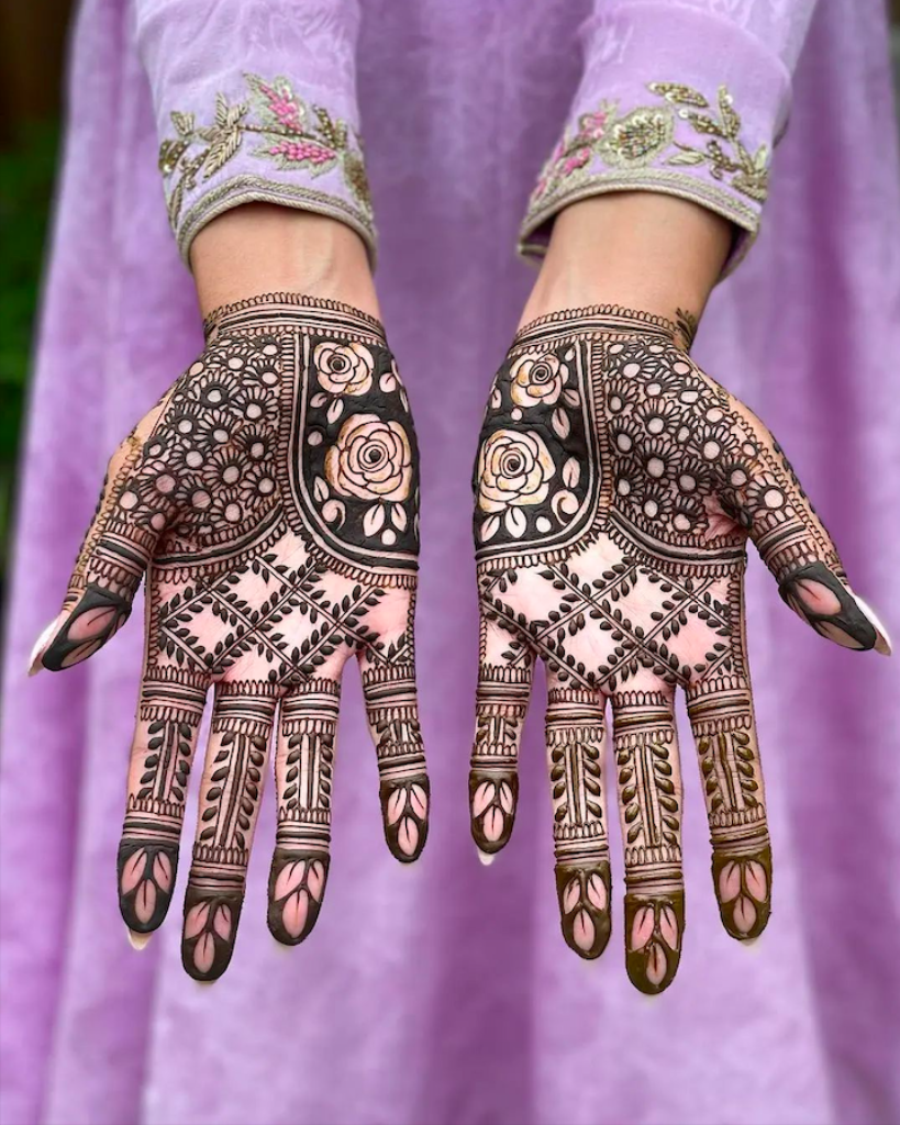 Fingers bordered Mehndi design places emphasis on decorating the borders of the fingers with intricate patterns. The central part of the hand may have simpler or more minimal designs, while the focus is on creating bold and elaborate patterns around the edges of each finger. The borders can include geometric shapes, swirls, dots, or paisley motifs, adding a unique and decorative touch to the overall Mehndi design.