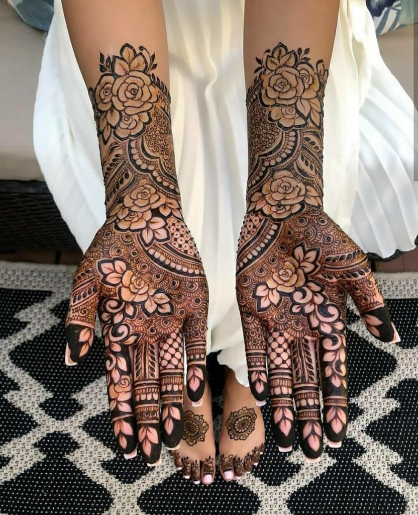 The floral Mughal mehndi design is one of the most popular mehndi designs. It features a wealth of intricate floral designs in the traditional Mughal style. This type of design is perfect for special occasions, such as weddings, festivals, and traditional ceremonies. The design is usually drawn from the wrist to the fingertips. Mughal mehndi designs are often characterized by their organic, symmetrical, curving vines and delicate floral elements.
