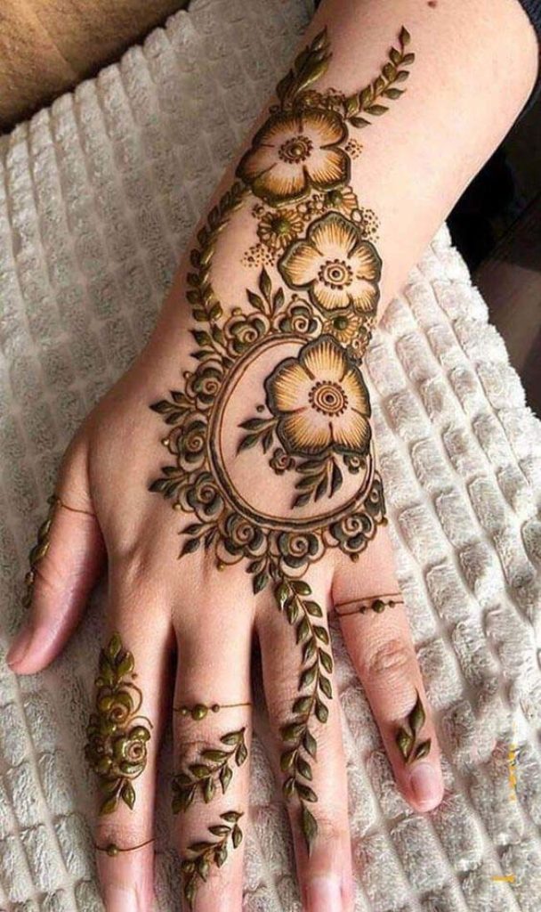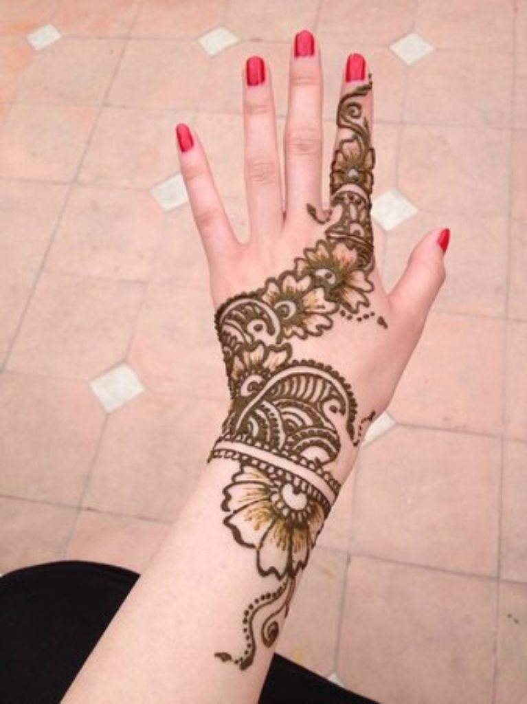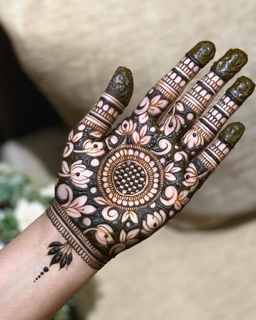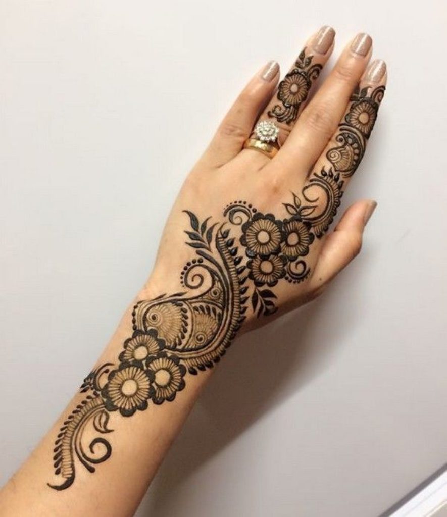 This mehndi design is quite graceful and delicate with beautiful flowers at its heart. The design starts off with a thin line pattern going around the palm, which then branches off into a multitude of intricate floral patterns. The flowers have been artistically drawn with its petals extending gracefully on all sides. The design is filled in with dark brown mehndi which highlights the beautiful details of the flowers.