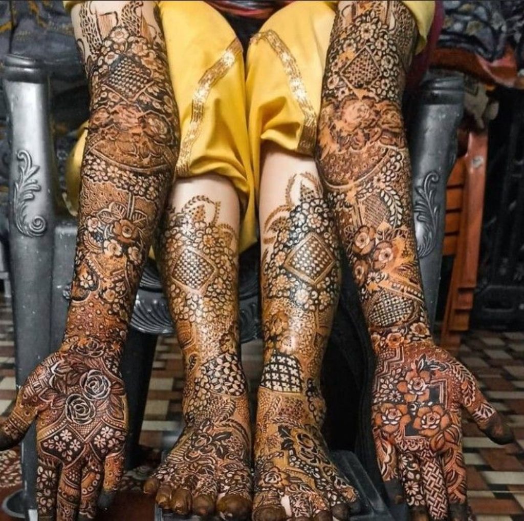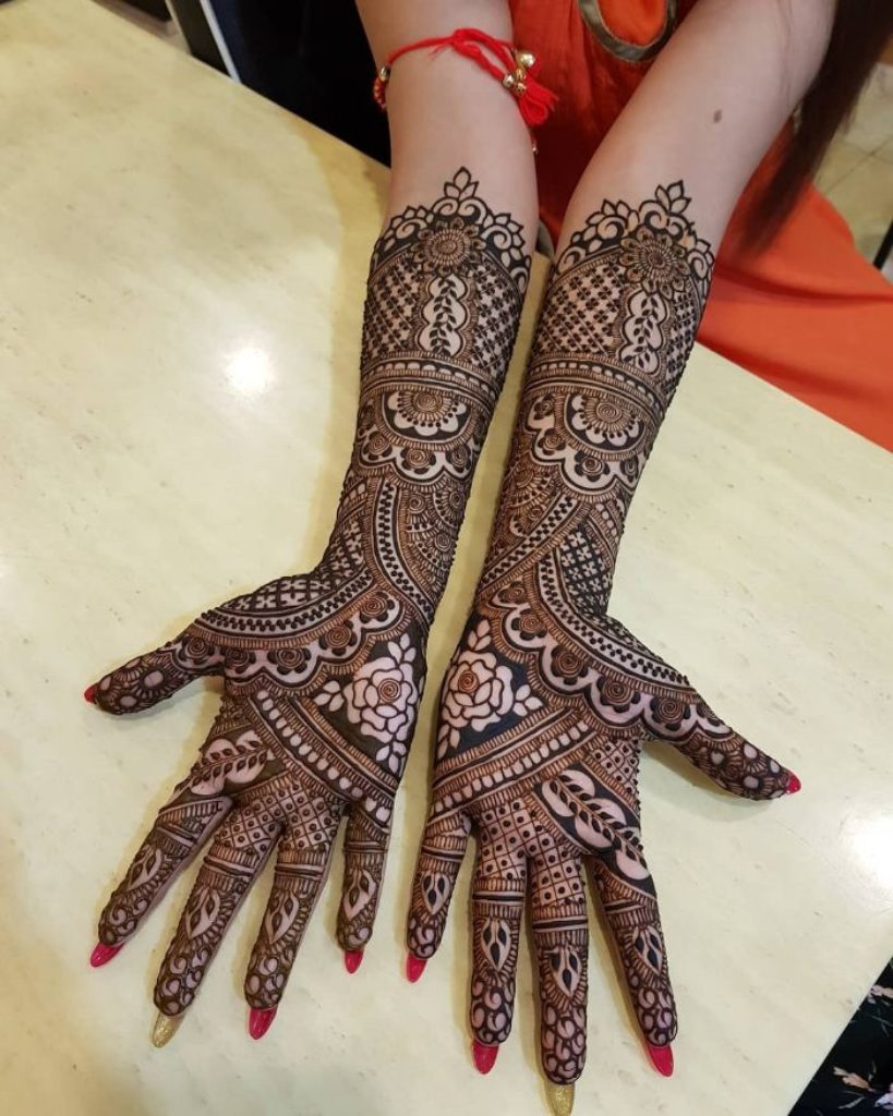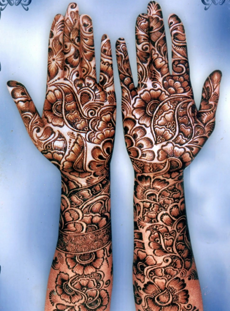 A vibrant and intricate mehndi design that covers the full hand with intricate and intricate floral patterns. The floral patterns are filled with various shades of henna dye, creating a unique look that looks stunning when worn. The floral patterns are often intricate and detailed, ranging in size and complexity to create a stunning and unique design.