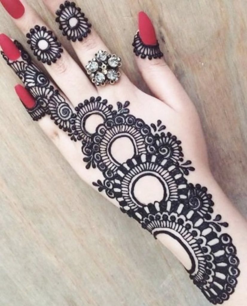 This mehndi design features a combination of different size and shapes. You can find bold and thick lines in a diagonal formation that encase and contain elegant round shapes for a nice contrast. The design features mainly black lines with subtle hints of other colors to give it an eye-catching look.