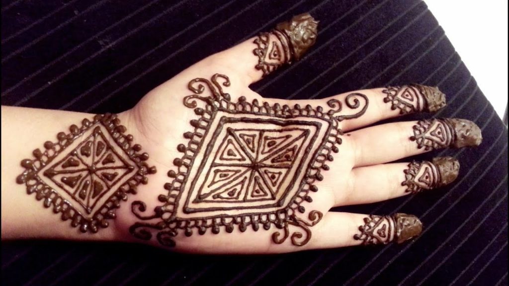 An inverted triangular and net mehndi design can create an interweaving pattern that draws the eye towards the hands and feet. The net design usually begins from the wrist and the ankle and extends towards the fingers or toes, forming a complex pattern of connecting lines and diamonds. Frames or borders of dots or points may section off sections of the design. Small inverted triangles scattered throughout the pattern give the overall design a poetic, open feel.