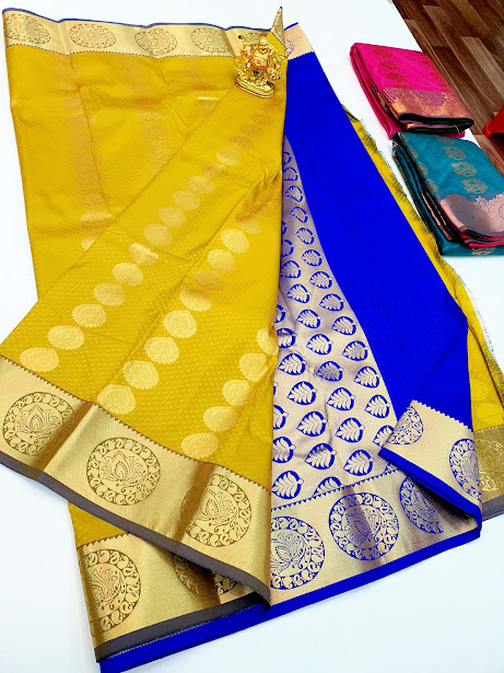 Beautiful Design Butta Mphoss Saree Yellow w/ Indigo Blue Color