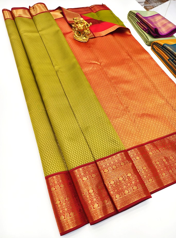 Beautiful Design Kanchi Semi Silk Saree Mustard Yellow Color w/ Blouse