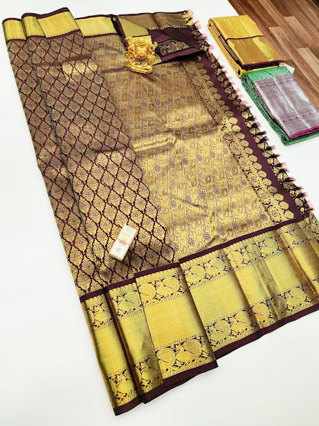 Beautiful Design Kanjivaram Pure Wedding Silk Saree Brown Color w/ Blouse