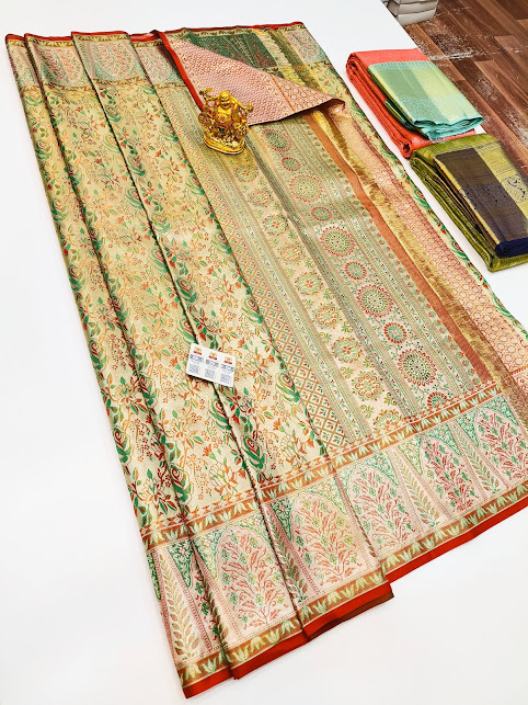 Beautiful Design Kanjivaram Pure Wedding Silk Saree Multi and Cream Color w/ Blouse
