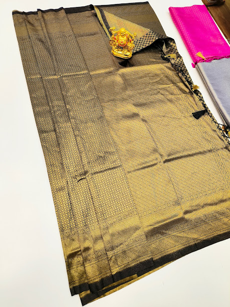 Beautiful Design Kanjivaram Semi Silk Saree Gold Zari and Black Color w/ Blue