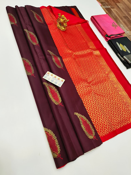 Beautiful Design Pure Kanjivaram Fancy Silk Saree Kumkum Red Color W/ Blouse