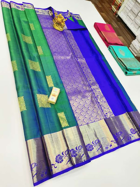 Beautiful Design Pure Kanjivaram Fancy Silk Saree Peacock Green Color w/ Blouse
