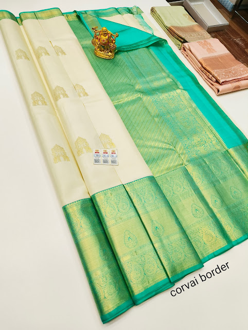 Beautiful Design Pure Kanjivaram Fancy Silk Saree White Color w/ Blouse