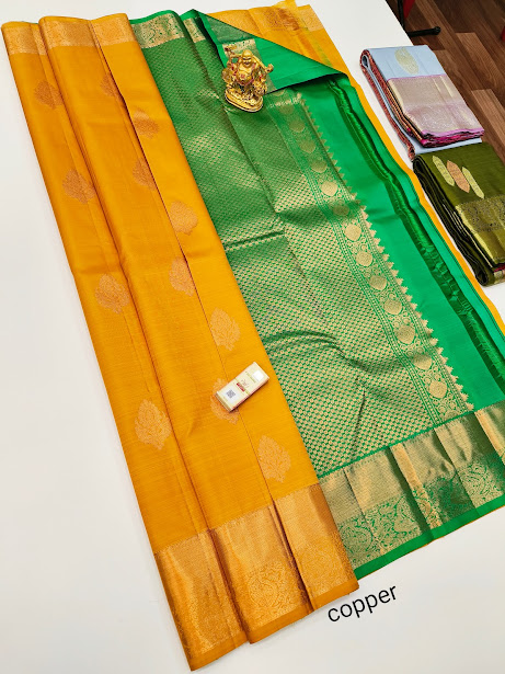 Beautiful Design Pure Kanjivaram Fancy Silk Saree Yellow Color w/ Blouse