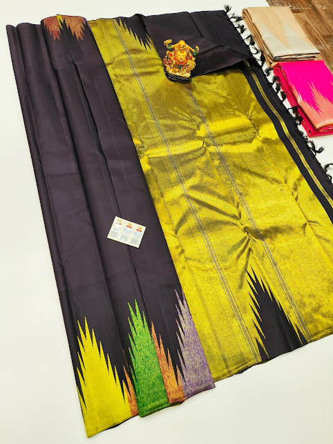 Beautiful Temple Design Pure Kanjivaram Fancy Silk Saree Black Color w/ Blouse