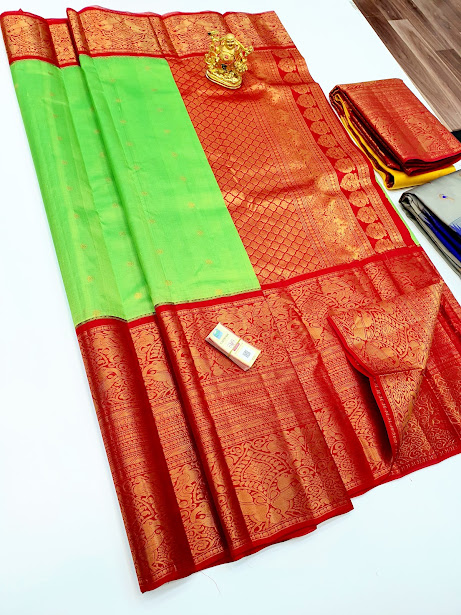 Big Border Design Pure Soft Silks Saree Green w/ Red Color