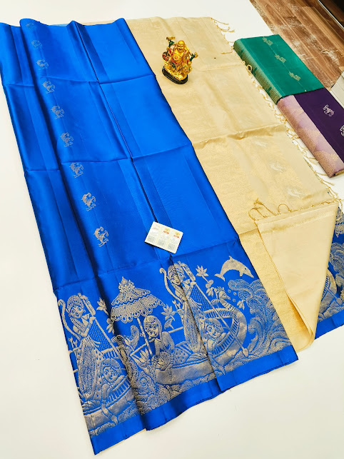 Boat and Girls Design Pure Soft Silk Saree Blue Color w/ Blouse