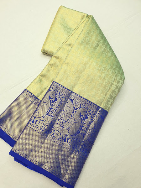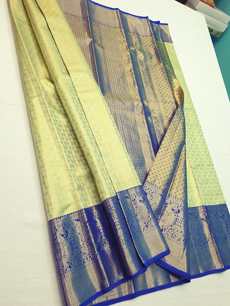 Bridal Collection Kanchi Pure Silk Saree Off White w/ Admiral Blue Color Annam Design