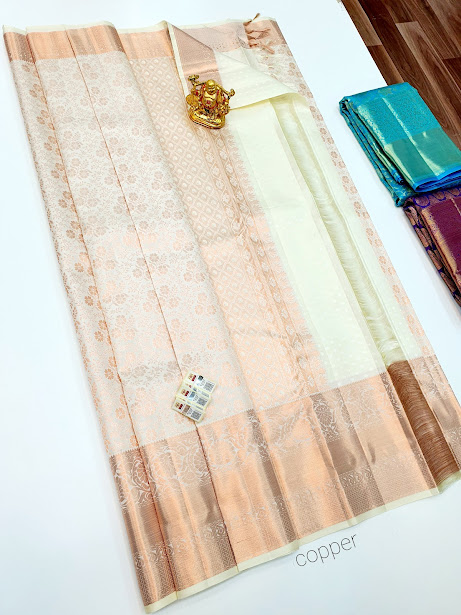 Copper Zari Work Flower Design Kanjivaram Pure Silk Sarees Off White Color w/ Blouse