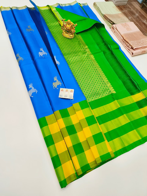 Deer Design Pure Kanjivaram Fancy Silk Saree Light Blue Color w/ Blouse