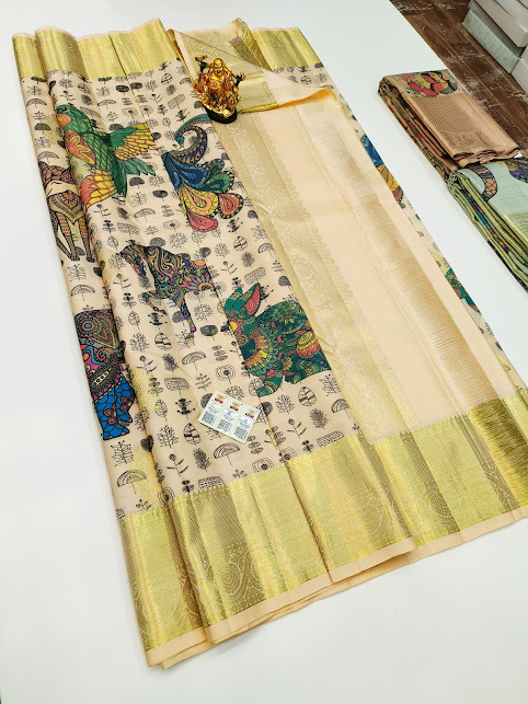 Different Animals Design Kanjivaram Pure Wedding Silk Saree Off White Color w/ Blouse