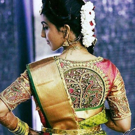 This double shade (pink & gold) designer blouse features a unique deer thread and patch work design. The front and back of this blouse are adorned with intricate thread work, while the neckline and sleeves are decorated with delicate patchwork. This blouse is perfect for formal occasions and is sure to make you stand out in the crowd.