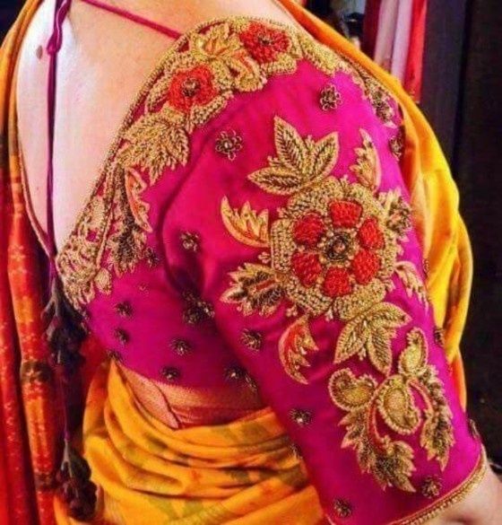 This different thread work designer blouse is made of pink fabric. It features an intricate thread work design on the front and back, while the neckline, cuffs and hemline are decorated with delicate embroidery work. The blouse is perfect for any formal occasion and is sure to turn heads.