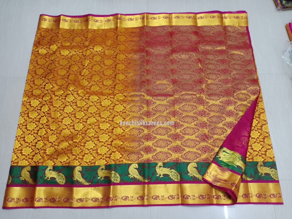 Economy Wedding Kanjivaram Pure Silk Sarees Golden Yellow Color Peacock Design