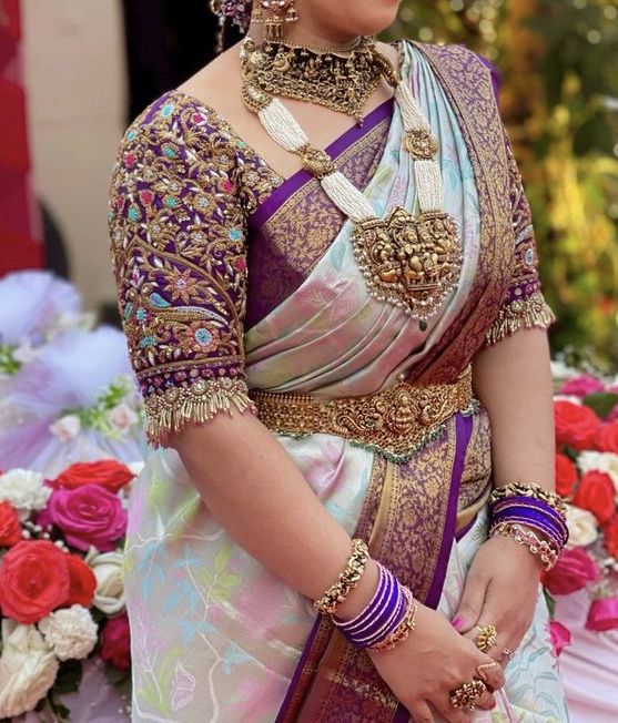 • Color / Design – Violet Color Thread and Pearls Work Design
