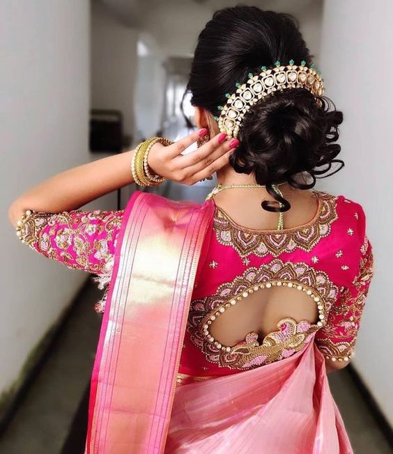Whats App for Latest Sarees & DesignsThis embroidery and stone work bridal designer blouse is a beautiful rose color. The neckline is cut in a V-shape and is finished off with intricate embroidery and sparkling stone work. It is perfect for a wedding or other special occasion. The blouse comes with a matching rose fabric belt for a more secure and stylish look.