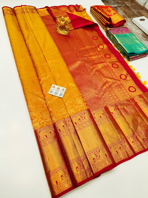 Floral Design Kanjivaram Pure Wedding Silk Saree Mango Yellow Color w/ Blouse