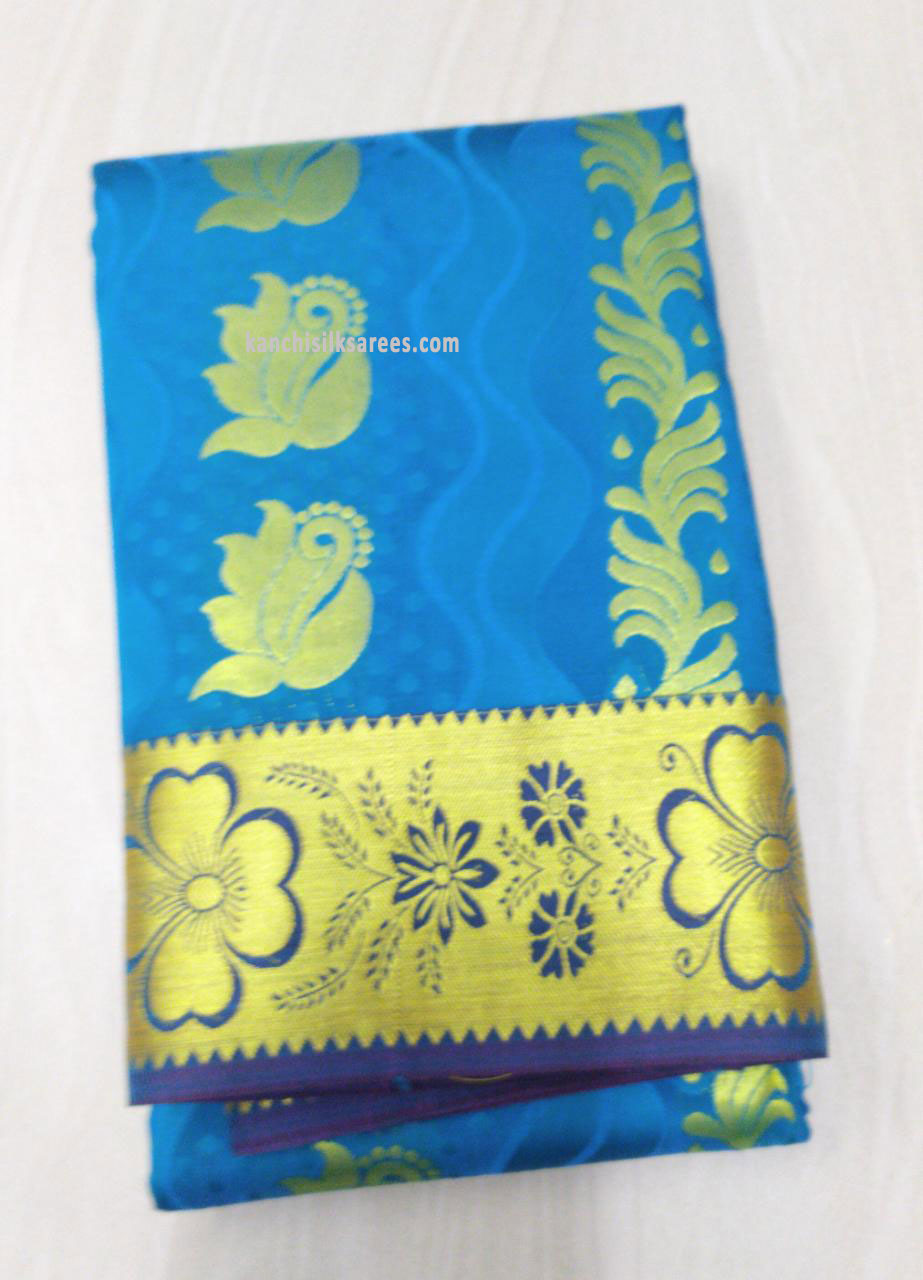 Flower Design Kanchipuram Silk Gift Sarees Sky Blue w/ Dark Blue Border Color