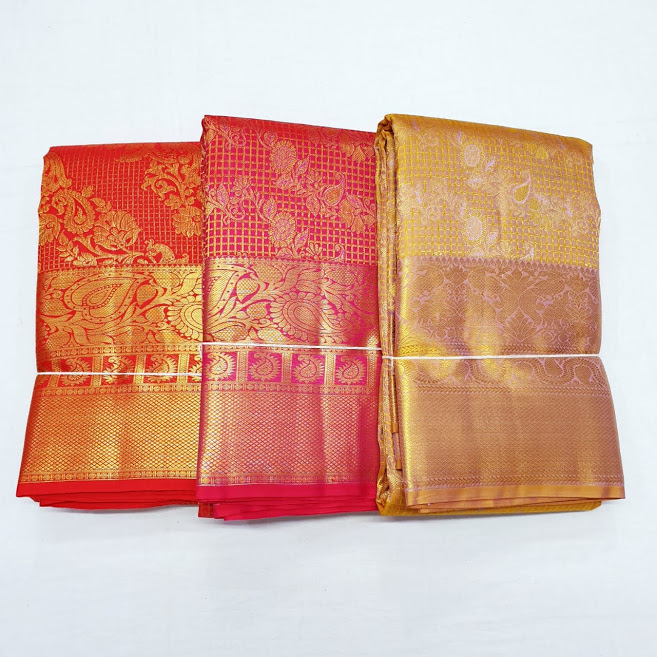 Full Gold Checks Jari Work Kanchipuram Bridal Collection Pattu Silk Sarees (Chilli Red / Pink / Golden Yellow)