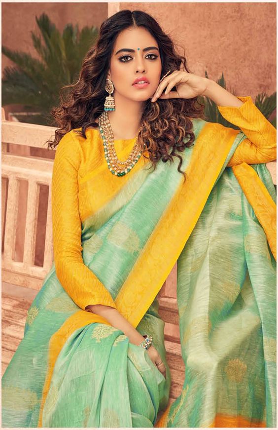 This full sleeves designer blouse is a bright and cheerful yellow color. The neckline is cut in a high and curved line and is finished off with detailed designs. It is perfect for everyday wear and special occasions alike. The blouse comes with a matching yellow fabric belt for a more secure and stylish look.