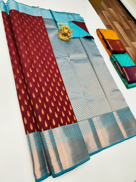 High Fancy Kanjivaram Silk Saree Mix Red and Sky Blue Color w/ Blouse