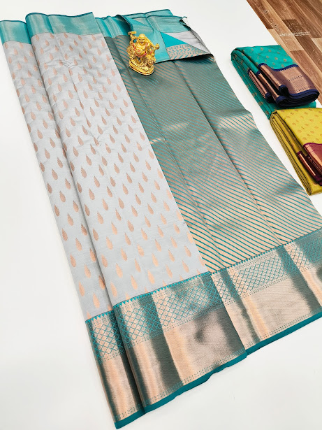 High Fancy Kanjivaram Silk Saree Mix White and Sky Blue Color w/ Blouse