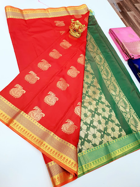 High Fancy Kanjivaram Silk Sarees Mix Red w/ Green Color