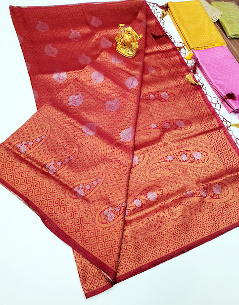 Kanjivaram Semi Silk Saree Apple Red Color w/ Blouse