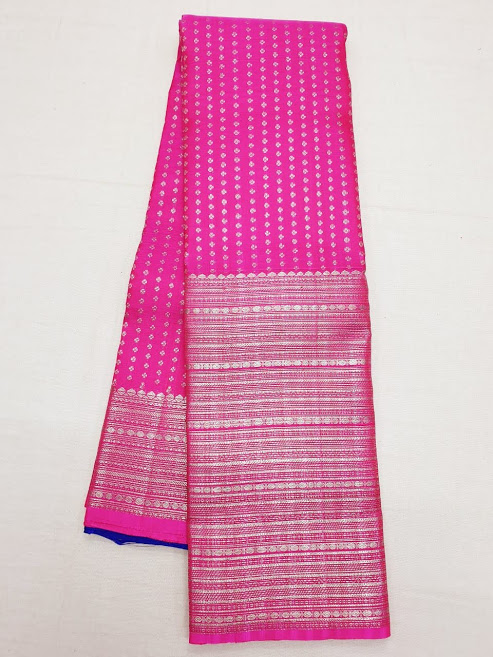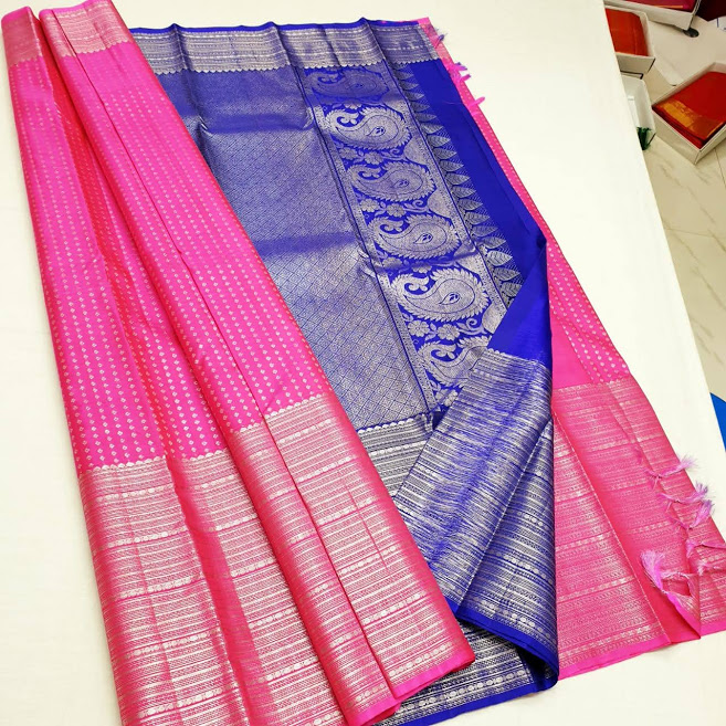 Kanchi Pure Soft Silk Big Border Saree Silver Jari Work Rose w/ Blue Color