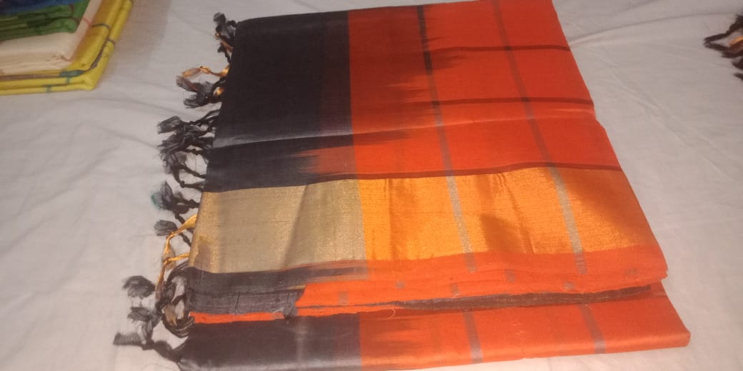 Kanchi Semi Silk Checks Cotton Sarees Cinnabar Orange w/ Charcoal Grey Color