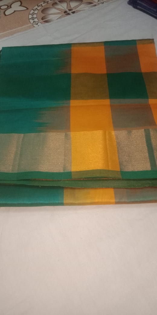 Kanchi Semi Silk Checks Cotton Sarees Ochre Orange w/ Deep Teal Blue Color