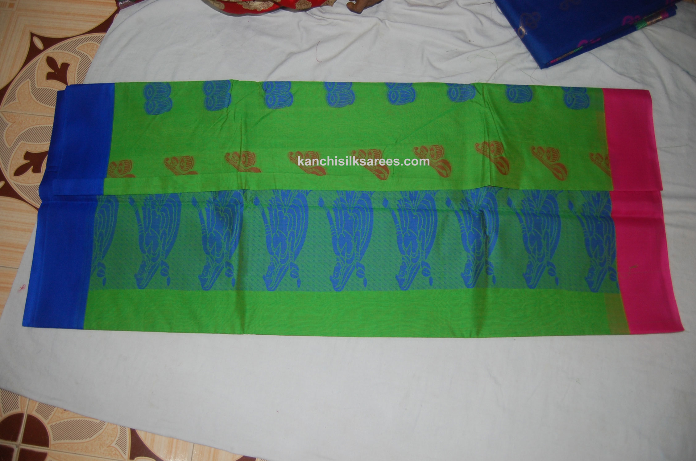 Multi color Green, Blue and pink all in one saree with Kanchi Semi cotton silk saree with intricate designs like dancing girls and Veena in the pallu and body.