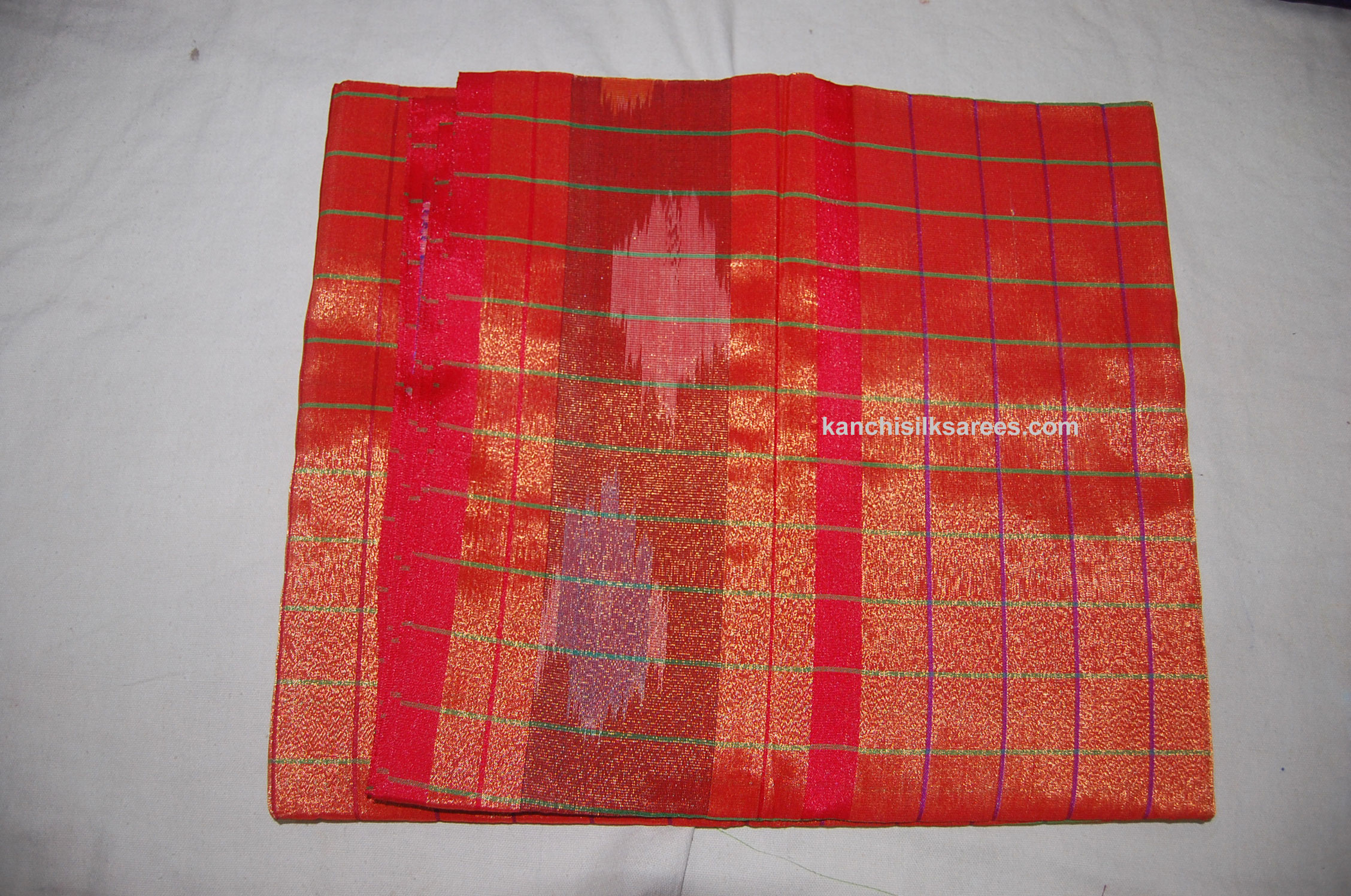 Kanchi Semi Silk Cotton Small Checks Sarees Fire Red Color Fully Zari Work