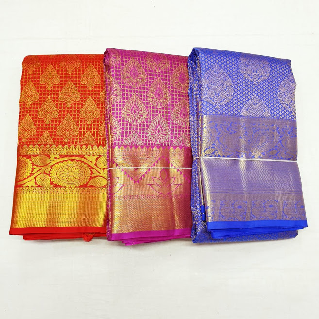 Whats App for Latest Sarees & DesignsSpecification: Kanchi Silk Saree Bridal Collection Gold Jari Work Design (Chilli Red / Pink / Blue)