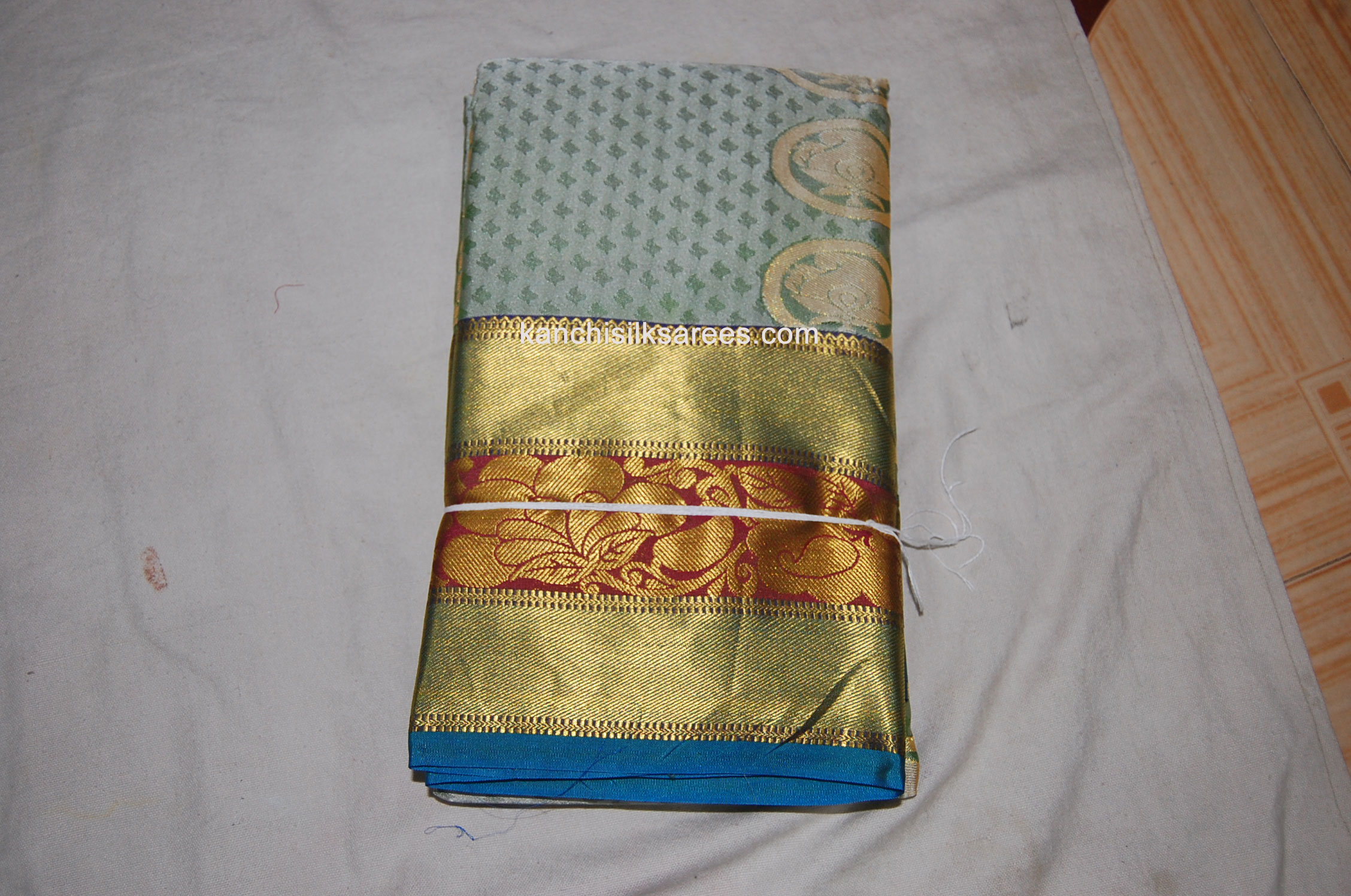 Kanchi Soft Pattu Sarees Mango Flower Design Spanish Green w/ Dark Cerulean Blue Color