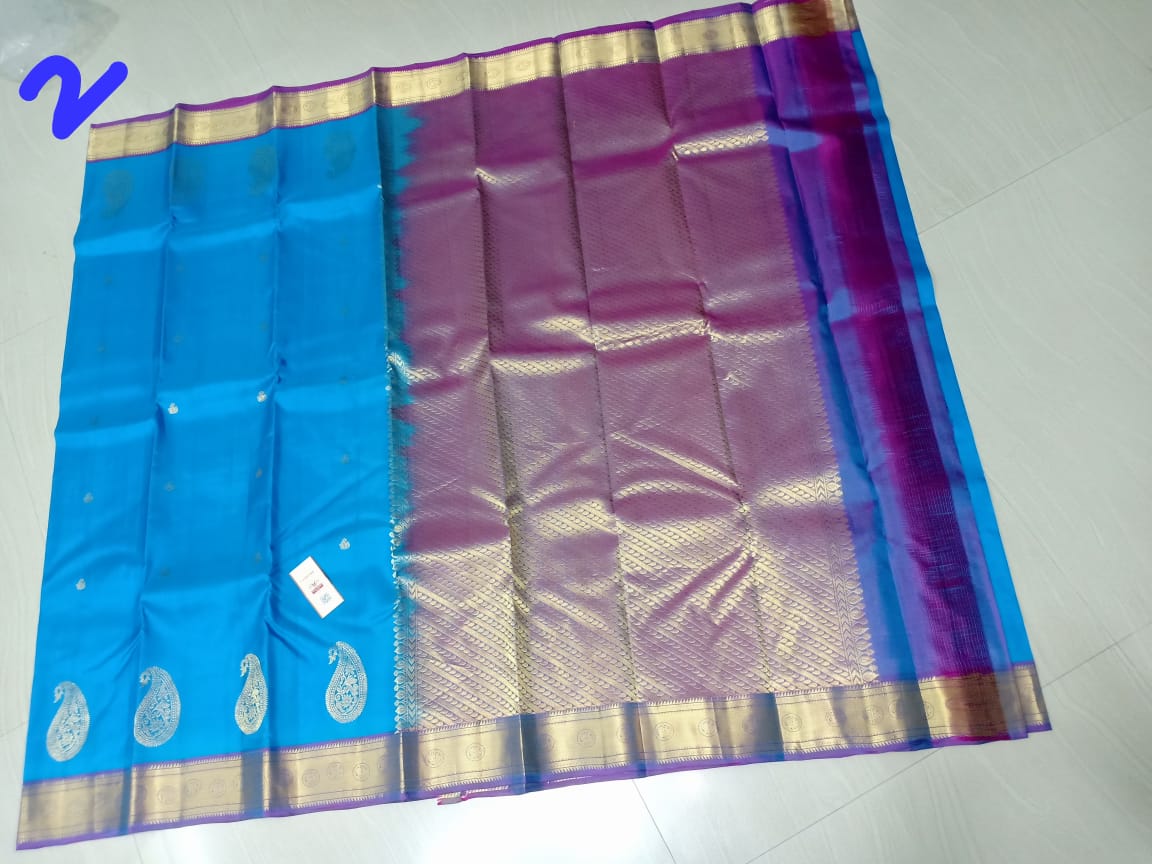 Kanchi Soft Silk Mango Zari Design Sarees Pacific Blue & Pink Shade Color