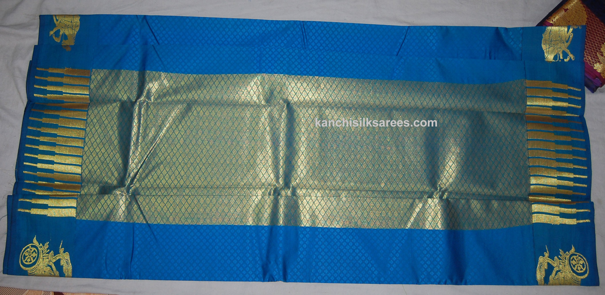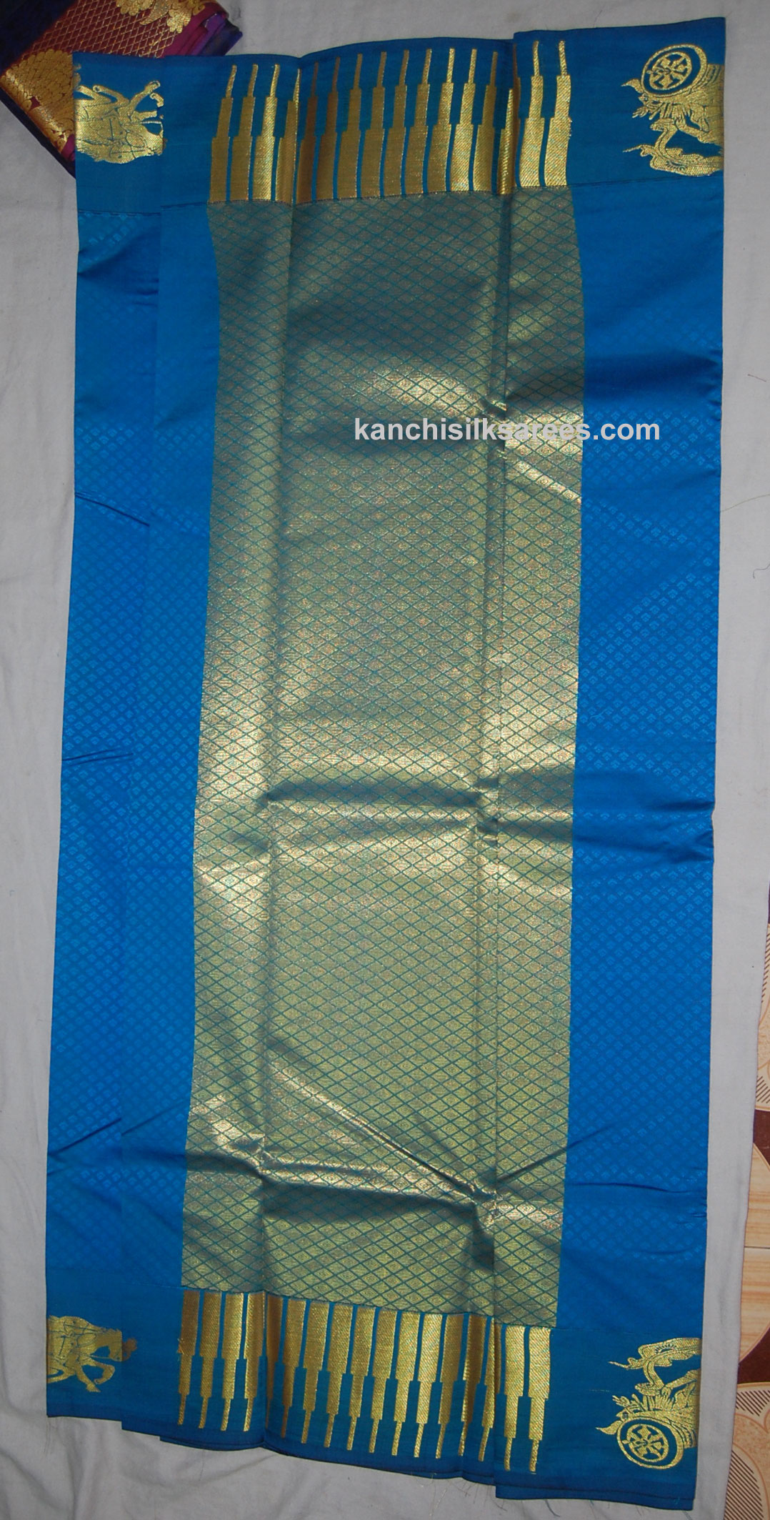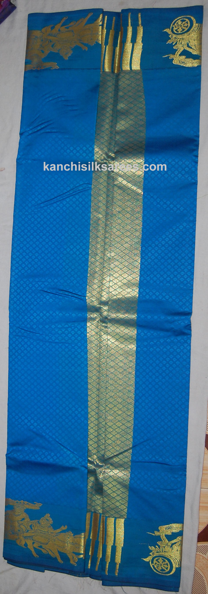 Most desirable and modish Kanchipuram soft silk sarees collections here at Kanchi silk sarees now showing you the Bhagavad Gita Border designs with Cobalt blue color body. Elegant to wear on an auspicious festivals with Kanchi Soft Silk variety at Home too.