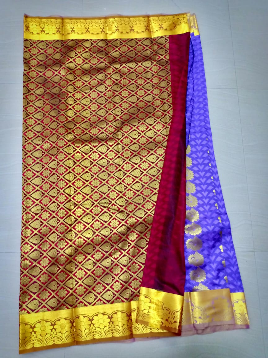Kanchi Soft Silk Sarees Flower Design Neon Blue w/ Burgundy Color